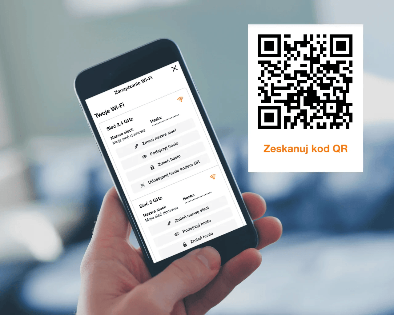 Sterujesz wygodnie: sprawdzisz i zmienisz hasło, udostępnisz je gościom za pomocą QR, podejrzysz podłączone urządzenia, zresetujesz i przywrócisz ustawienia fabryczne modemu.