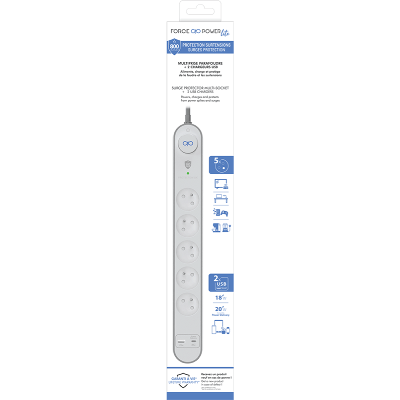 Listwa zasilająca wielogniazdowa z ochroną przeciwprzepięciową z 5 gniazdami europejskimi typu E + 2 gniazda USB A i USB C. Gniazda rozmieszczone naprzemiennie pod kątem 45 ° i znacznie bardziej odsunięte od siebie, aby ułatwić korzystanie z wielu ładowarek i zasilaczy jednocześnie. Zwiększona odporność na porażenie prądem elektrycznym do 800 dżuli. Dioda wskazująca na poziom zabezpieczenia przeciwprzepięciowego. Kabel optymalnej długości 1,5 m. Dwa sposoby montażu do wyboru. Produkt posiada dożywotnią gwarancję , co oznacza, że w przypadku uszkodzenia produktu raz w roku można wymienić produkt na nowy. W tym celu należy zarejestrować się w serwisie gwarancyjnym w ciągu 30 dni od transakcji z dowodem zakupu.