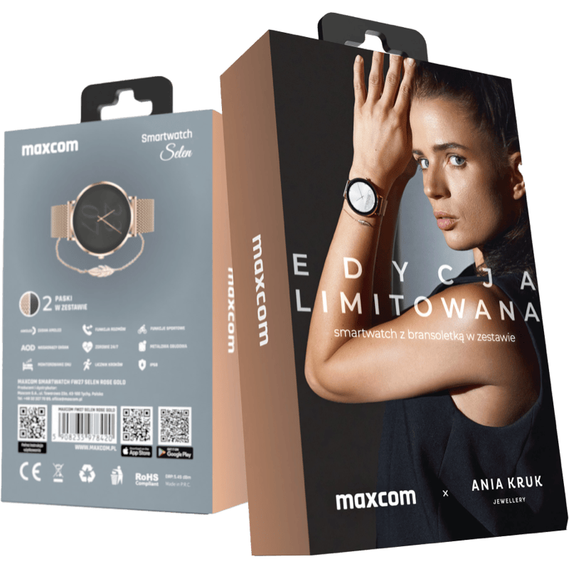 • Niezależnie od tego, czy jesteś w pracy, na treningu czy na randce, smartwatch Maxcom FW27 Selen uzupełni Twój look w każdej sytuacji. Dwa dostępne paski: ze stali nierdzewnej i tekstylny, możesz wymieniać w zależności od okoliczności i efektu, jaki chcesz uzyskać. Całości dopełnia pozłacana bransoletka marki ANIA KRUK, dołączona do zestawu, która efektownie prezentuje się na nadgarstku. Dzięki takiemu biżuteryjnemu kompletowi poczujesz się naprawdę wyjątkowo.